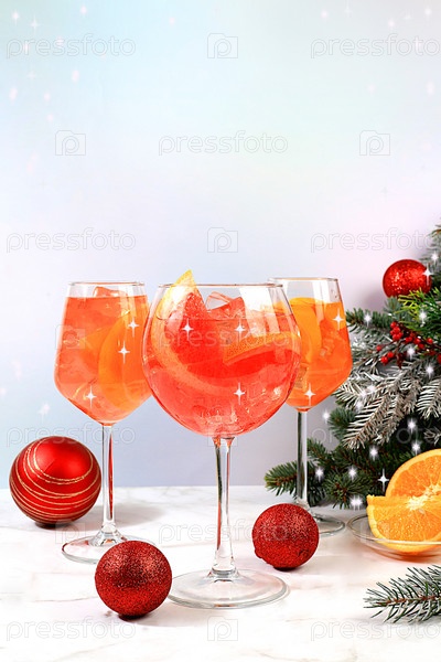 Рождественский алкогольный коктейль Aperol spritz в бокалах на праздничном фоне с ветвями елки и украшениями, концепция бара и канун Нового года, спиртные напитки на вечеринке, выборочный фокус