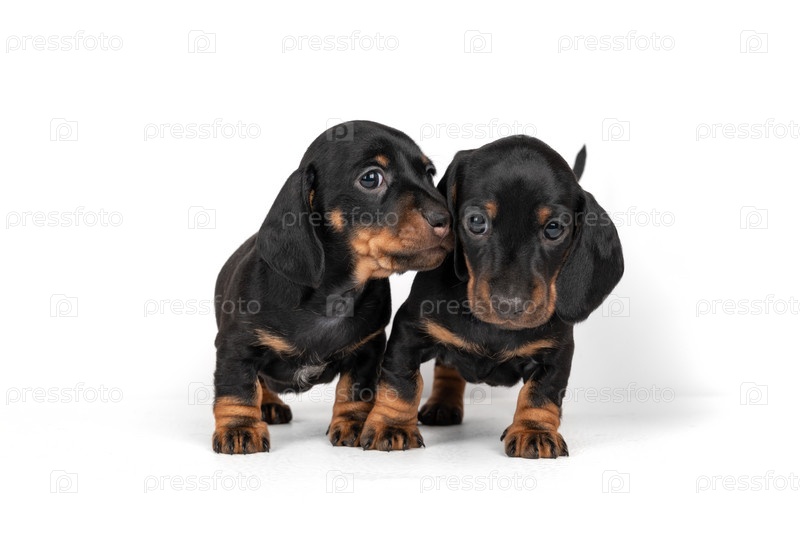 Два маленьких черных щенка таксы смотрят друг на друга. Маленькие собаки смотрят с любовью на тренера. Выделено на белом фоне