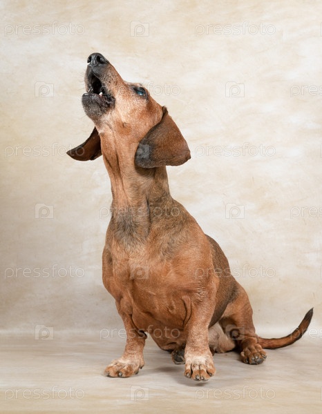 Такса сидит на светлом фоне, смотрит вверх и лает. Портрет старой собаки