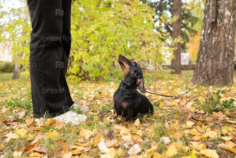 Очаровательная миниатюрная такса с блестящей шерстью и проникновенными глазами на поводке у своего хозяина в живописном осеннем парке. Собака внимательно сидит среди деревьев, покрытых желтой листвой