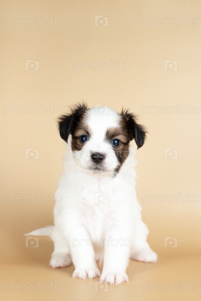 Маленький щенок папильона возрастом 1 месяц, изолированный на бежевом фоне