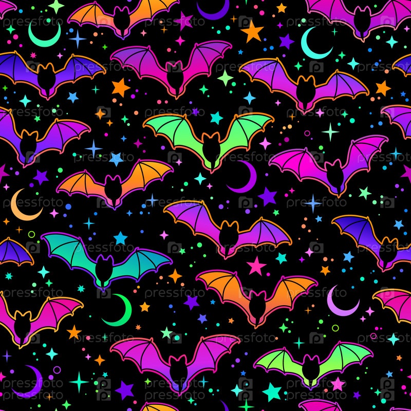 Бесшовный узор из разноцветных ярких летучих мышей