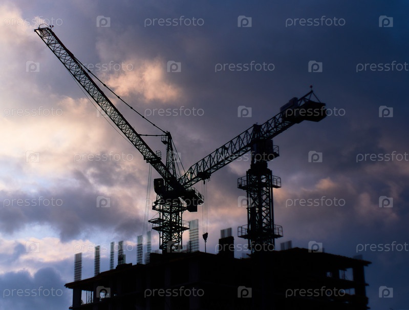 Силуэты подъемных кранов на фоне неба