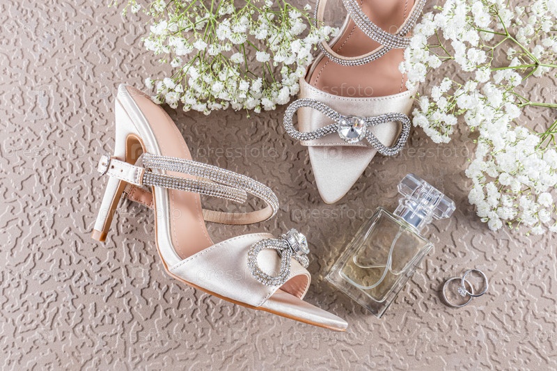 Нежный свадебный натюрморт из деталей свадьбы. атласные туфли с бантом из страз, духи, кольца, веточки белой гипсофилы. вид сверху