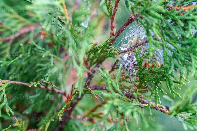 Серый паук с яйцом - коконом плетет паутину на туе после дождя