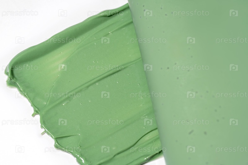 Зеленая косметическая текстура мазка. Образец средства по уходу за кожей. Образец маски для лица из зеленого чая, каолина или спирулины на белом фоне. Лечение против акне