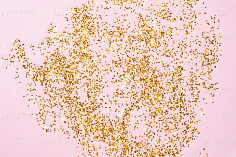 Яркий красочный сверкающий золотой блеск, крупный план. Фон для приглашений на вечеринку или праздничных открыток, розовый фон