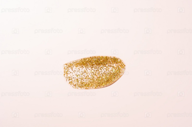 Золотистый блестящий гель-мазок на пастельно-розовом фоне. Блестящие частицы на жидкости. Образец образца