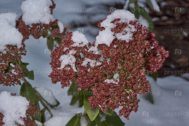 Очиток виден, крупный план цветения после снегопада.Очиток видимый (лат. Hylotelephium spectabile) многолетнее травянистое растение, суккулент Зима, декабрь 2024 г