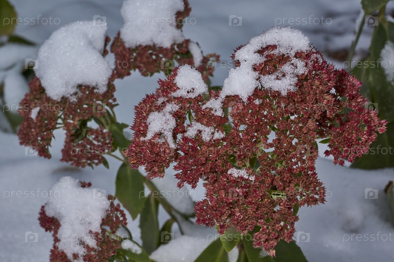 Очиток виден, крупный план цветения после снегопада.Очиток видимый (лат. Hylotelephium spectabile) многолетнее травянистое растение, суккулент Зима, декабрь 2024 г