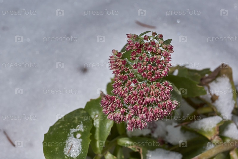 Очиток виден, крупный план цветения после снегопада.Очиток видимый (лат. Hylotelephium spectabile) многолетнее травянистое растение, суккулент Зима, декабрь 2024 г