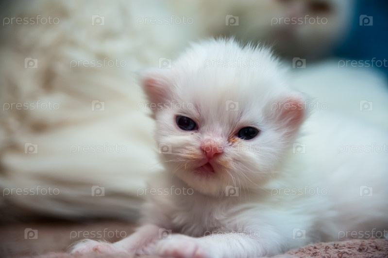 Новорожденный котенок белой персидской кошки в макросъемке