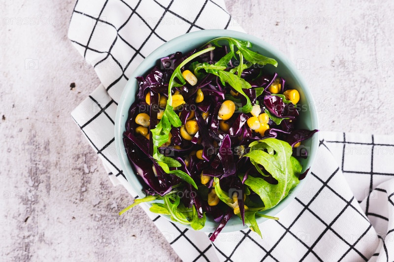 Крупный план салата из красной капусты, кукурузы и рукколы в миске на столешнице