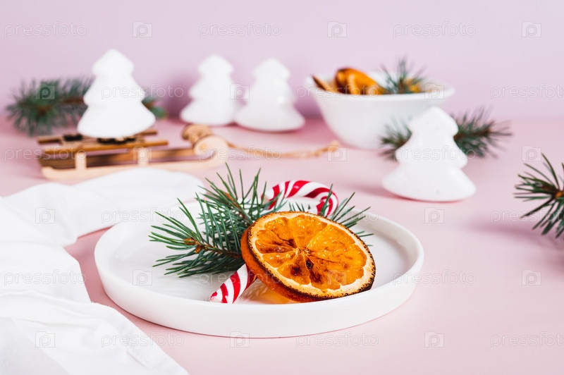 Рождественская сервировка стола леденец, елка и сушеный апельсин на тарелке на столе