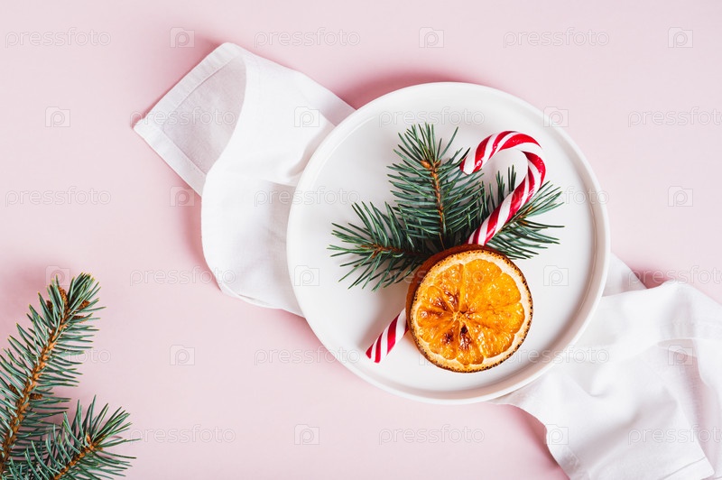 Крупный план рождественской сервировки стола: леденец, елка и сушеный апельсин на тарелке на столешнице