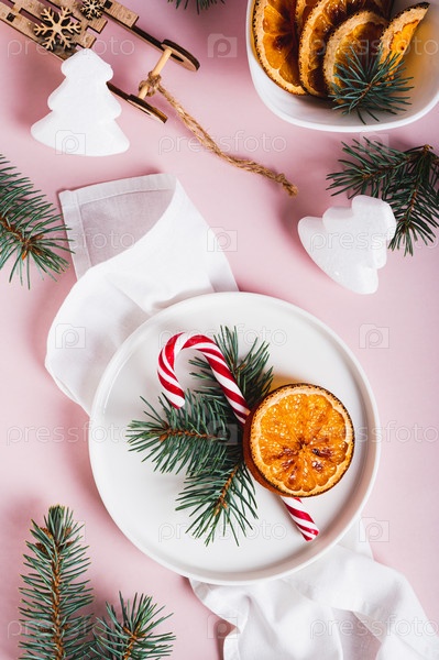 Конфета, апельсин и елка на тарелке на столе в праздничном оформлении, вид сверху и вертикальный вид