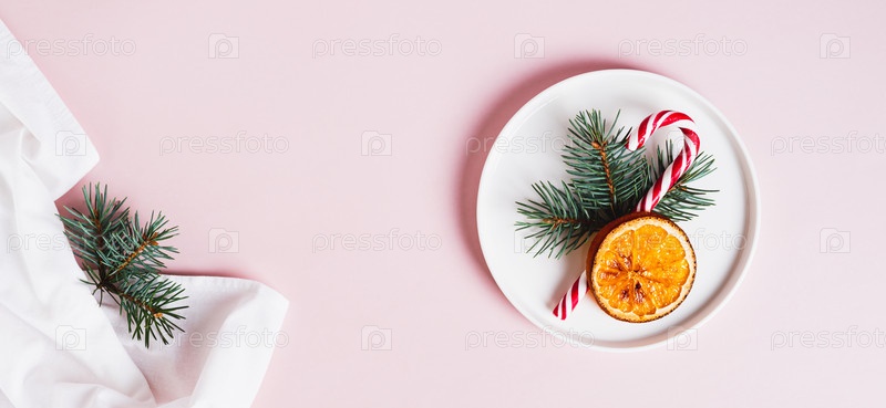 Конфета, апельсин и елка на тарелке на столе в праздничном оформлении, вид сверху, веб-баннер