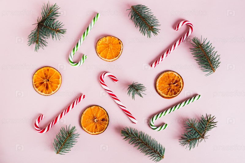 Рождественский фон из леденцов, сушеных апельсинов и еловых веток на розовом фоне, вид сверху