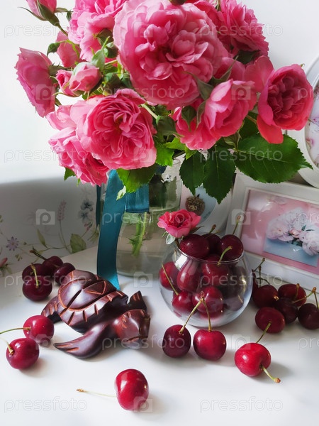 Натюрмортная композиция с букетом розовых роз, свежей вишней и деревянной фигуркой черепахи