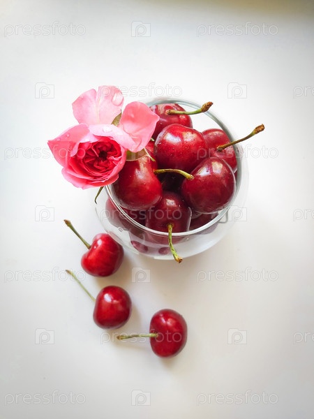 Свежая вишня и розовая роза создают яркую картину цвета и естественной красоты