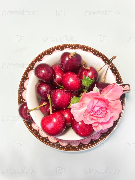 Свежесорванные вишни и розовая роза покоятся в декоративном блюдце для чайной чашки, создавая яркий натюрморт