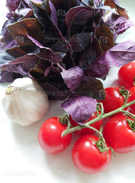 Яркие помидоры черри на ветке, фиолетовые листья базилика и головка чеснока на белом фоне — все готово к приготовлению