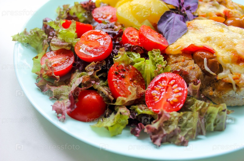 Вкуснейшее мясо и картофель в панировке, подается со свежими помидорами черри и салатом-латуком на светло-голубой тарелке