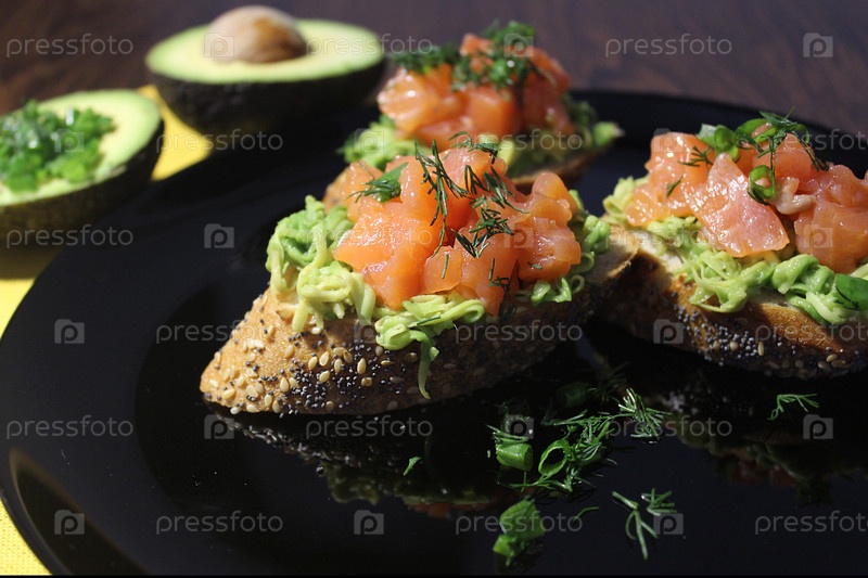 Тост с лососем, авокадо и свежим укропом, подается на черной тарелке