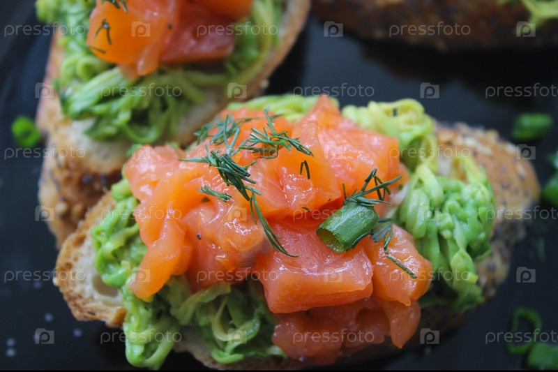 Ломтики копченого лосося, подаваемые на поджаренном многозерновом хлебе с пюре из авокадо, свежим укропом и зеленым луком