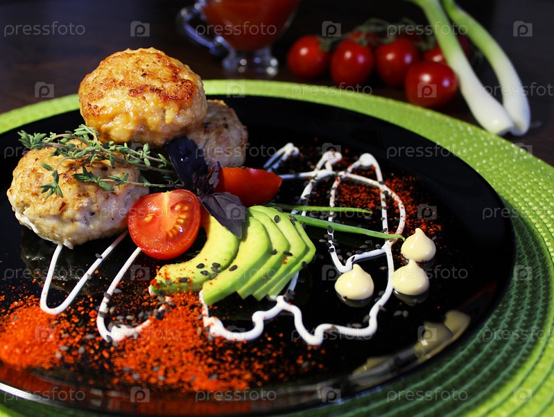 Куриные котлеты с авокадо и помидорами черри на черной тарелке