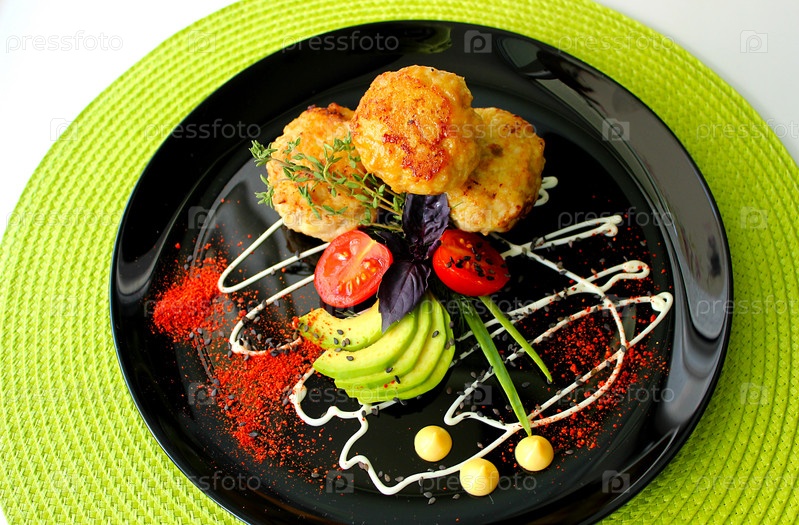 Куриные котлеты с авокадо и помидорами черри, украшенные зеленью и специями на черной тарелке