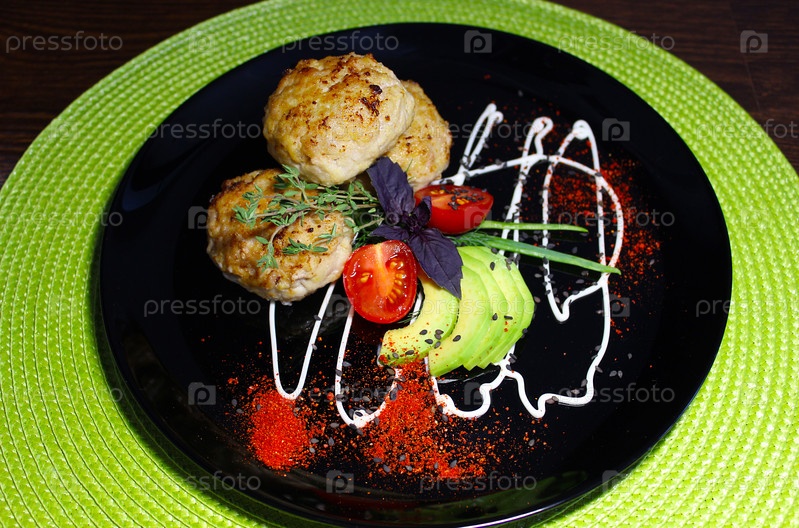 Куриные котлеты с авокадо и помидорами на черной тарелке
