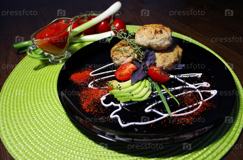 Куриные котлеты подаются на черной тарелке с авокадо, помидорами, зеленью и специями, создавая визуально привлекательную кулинарную сцену