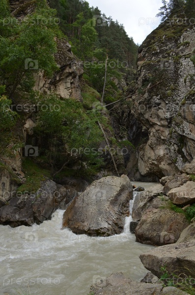 Водопад на бурной горной реке Адыр-су в Баксанской долине, Кабардино-Балкарская Республика, Эльбрусский район