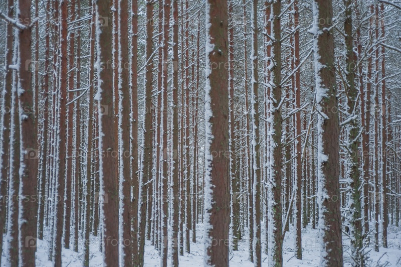 Стволы деревьев зимой в густом лесу в снегу