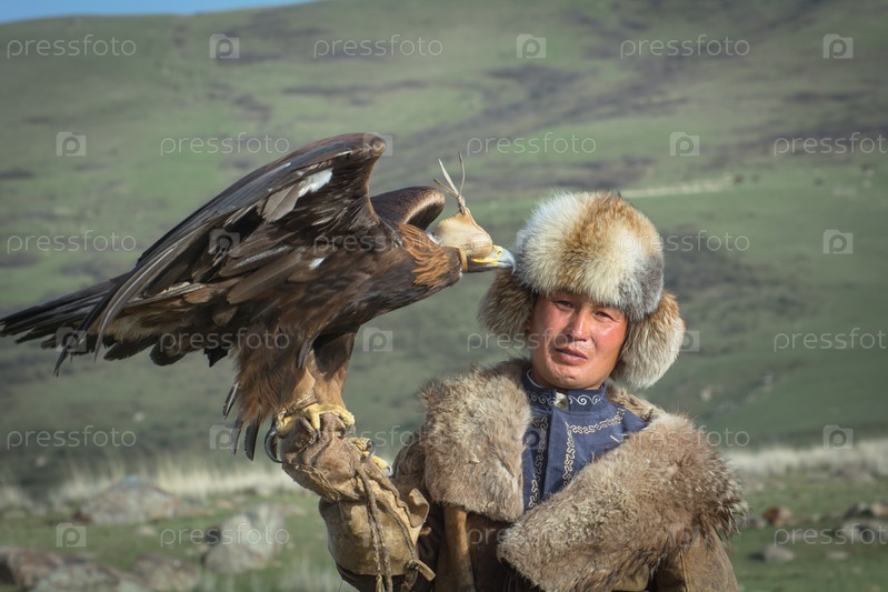 Молодой киргиз держит на руке расправившего крылья орла