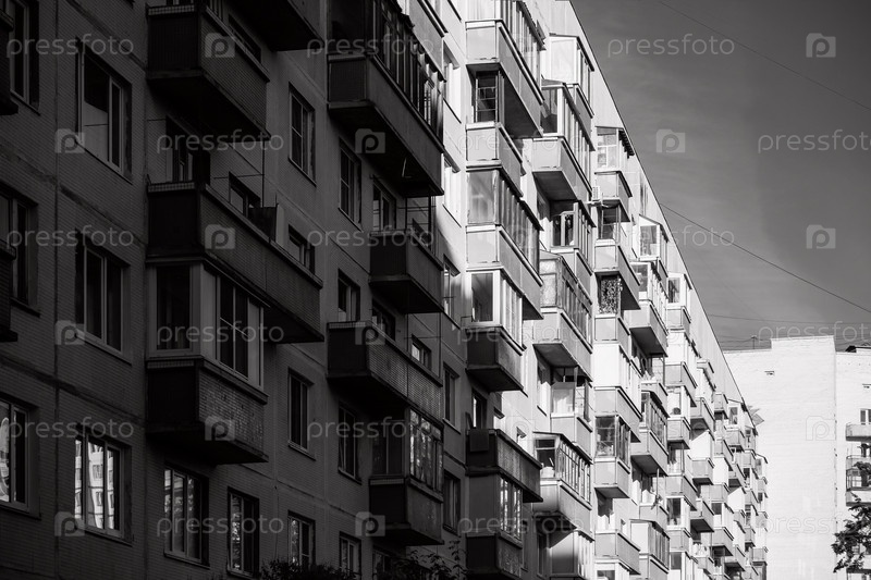 Стена многоквартироного жилого дома, освещенная частично солнечным светом, черно-белый кадр