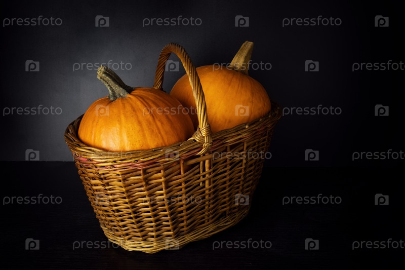 Две свежие спелые тыквы в плетеной корзине на темном фоне