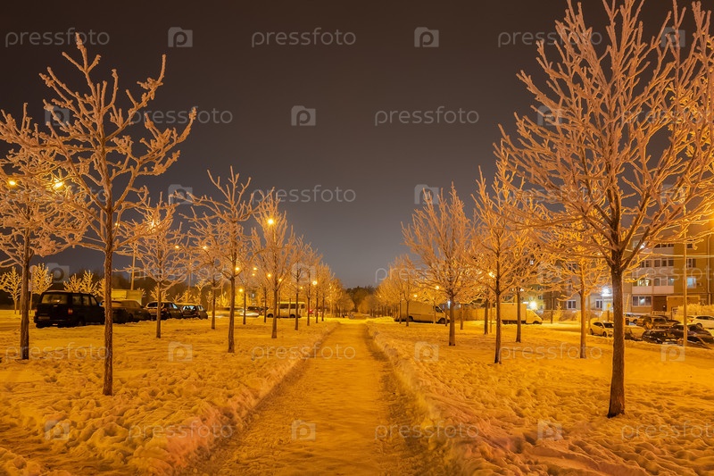 Заснеженная безлюдная улица, деревья покрытые инеем, ночной городской пейзаж, занесенная снегом пешеходная дорожка