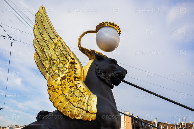 Крылатый лев на Банковском мосту, вид сбоку на фоне голубого неба - Санкт-Петербург, Россия, Май 2024