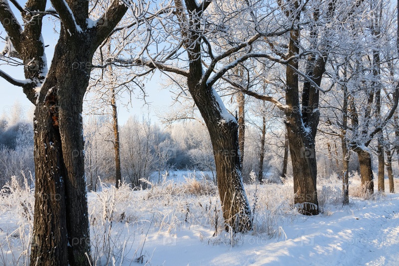 Занесенный снегом парк, покрытые снегом деревья, солнечный зимний день