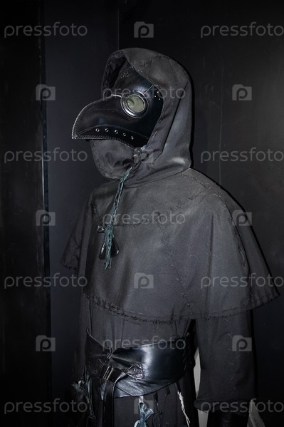Чумной доктор в черном костюме и носатой маске в Музее аномалий тела - Санкт-Петербург, Россия, Март 2024