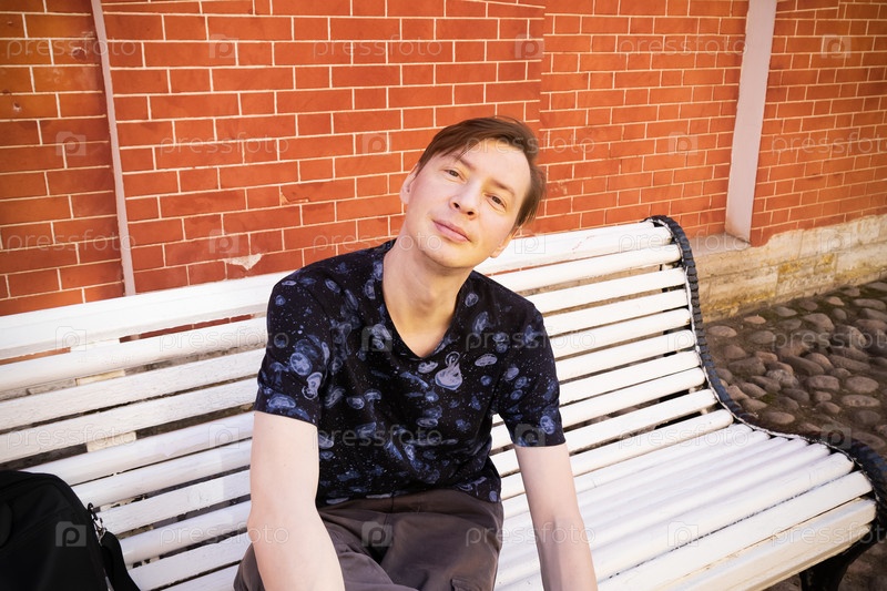 Симпатичный парень сидит на белой скамейке напротив оранжевой кирпичной стены