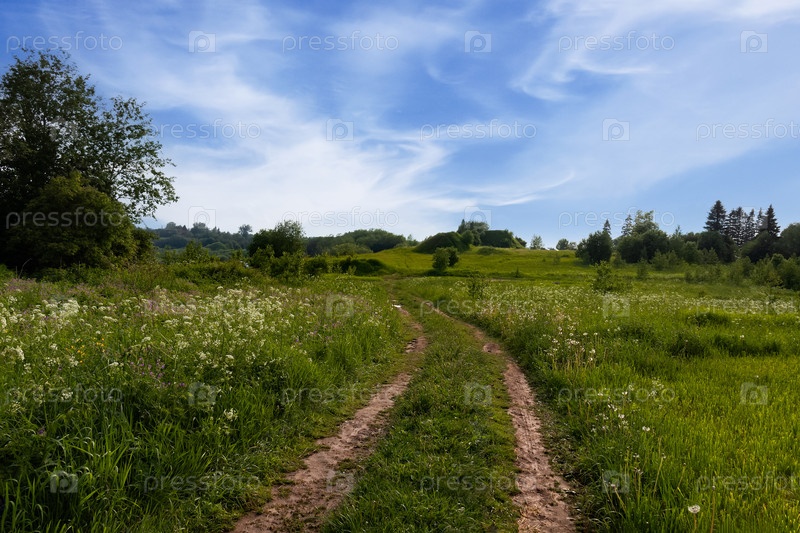 Колея среди зеленой травы, летний пейзаж под голубым небом