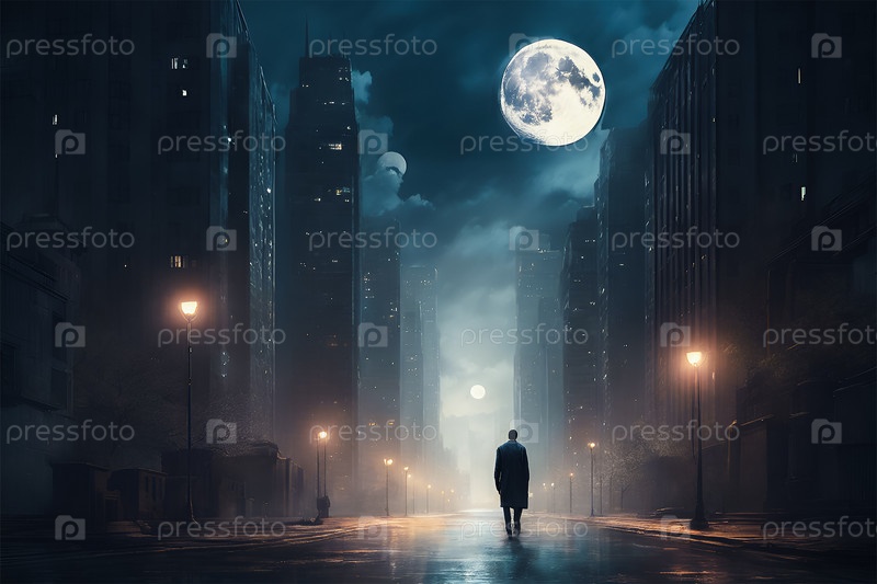 Улица ночного города, идущий среди небоскребов человек, больша луна в небе, городской ночной пейзаж создан нейросетью