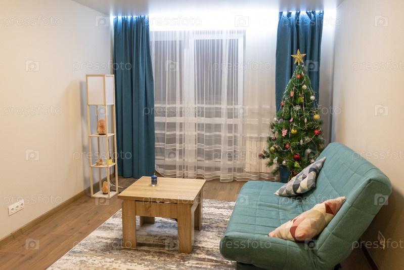 Снимок небольшой квартиры с украшенной рождественской елкой. Сезон