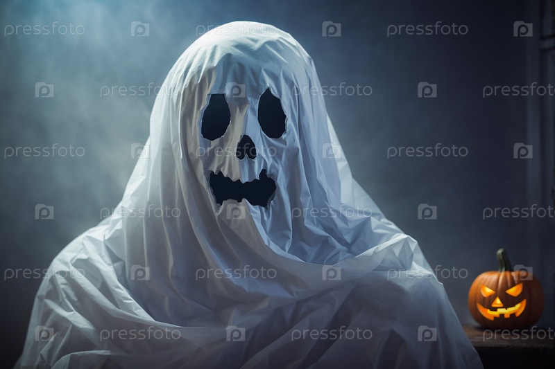 Страшное привидение, кто-то в костюме из простыни с пустыми глазами и ртом, тыква светильник Джека, антураж на Хэллоуин