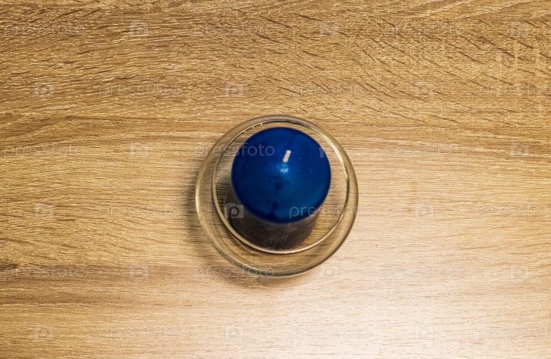 Крупным планом видна ароматическая свеча синего цвета на деревянном столе. Концепция