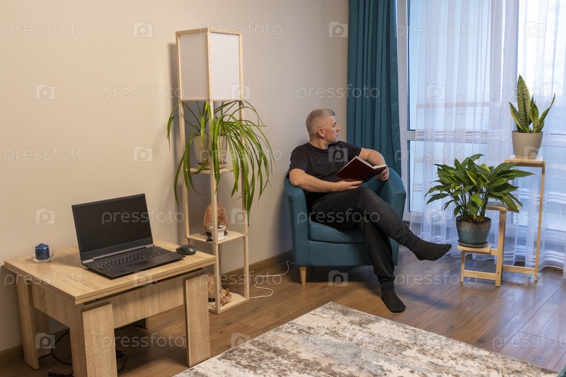 Мужчина с телефоном сидит в уютном углу квартиры на удобном кресле. Люди