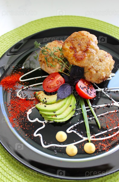Куриные котлеты подаются с авокадо, помидорами и специями на черной тарелке